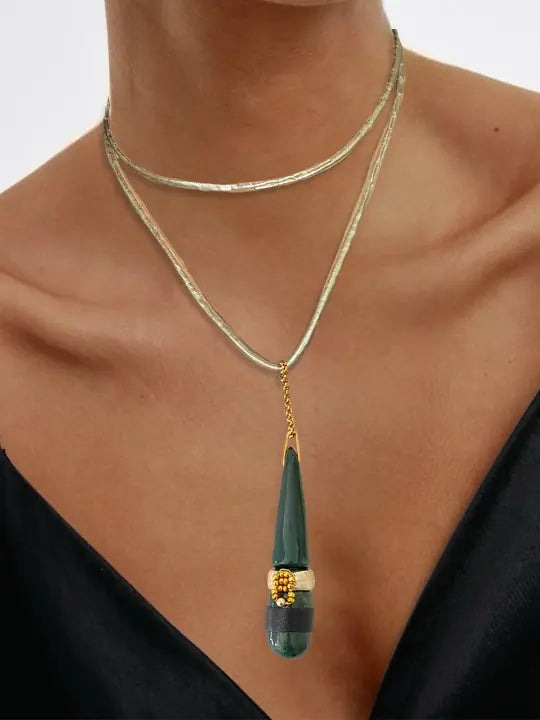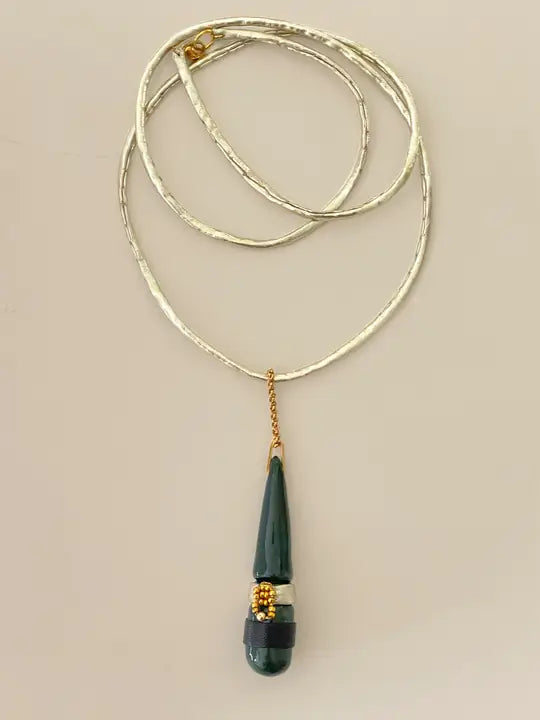 Tamamı el yapımı olup hamurun elde şekillendirilmesiyle tasarlanmıştır. Gold ışıltılı deri kordon ile gönderilir. Kullanılan zincir detayı çeliktir.